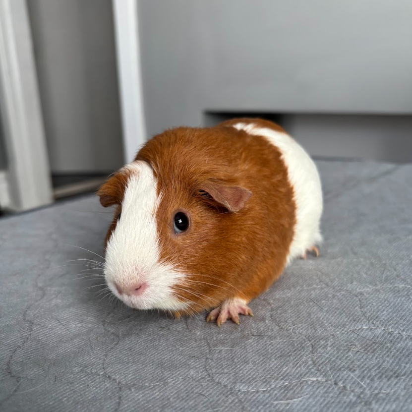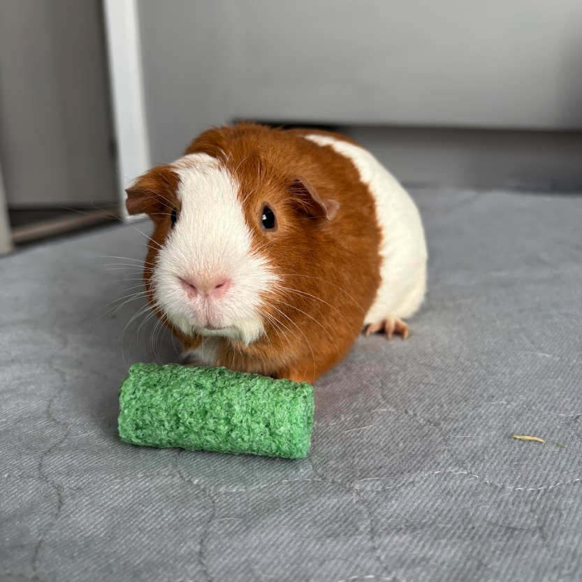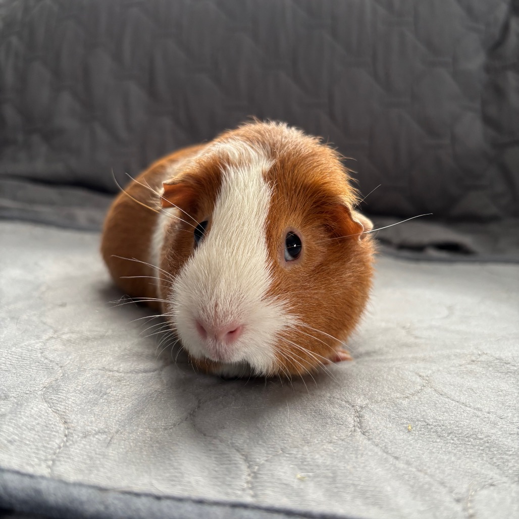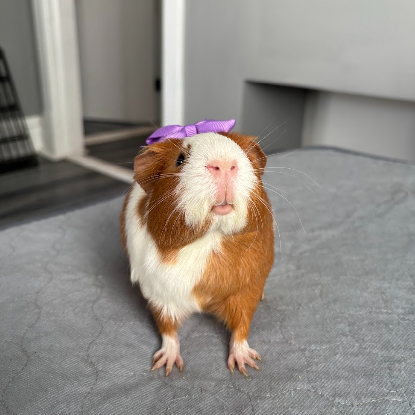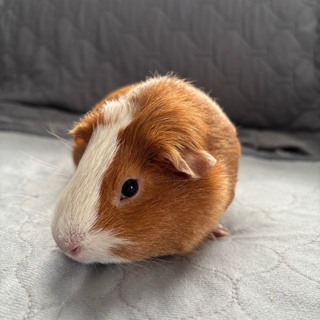 She’s especially enthusiastic when food is involved, always ready to investigate anything that crinkles or crunches! Turbopig is a quiet, thoughtful girl who enjoys lap time and gentle scratches, but her real joy comes from exploring new spaces—especially if she has a guinea pig buddy by her side.