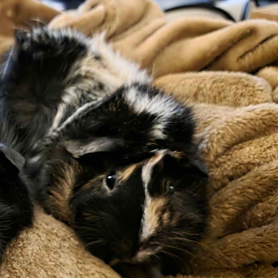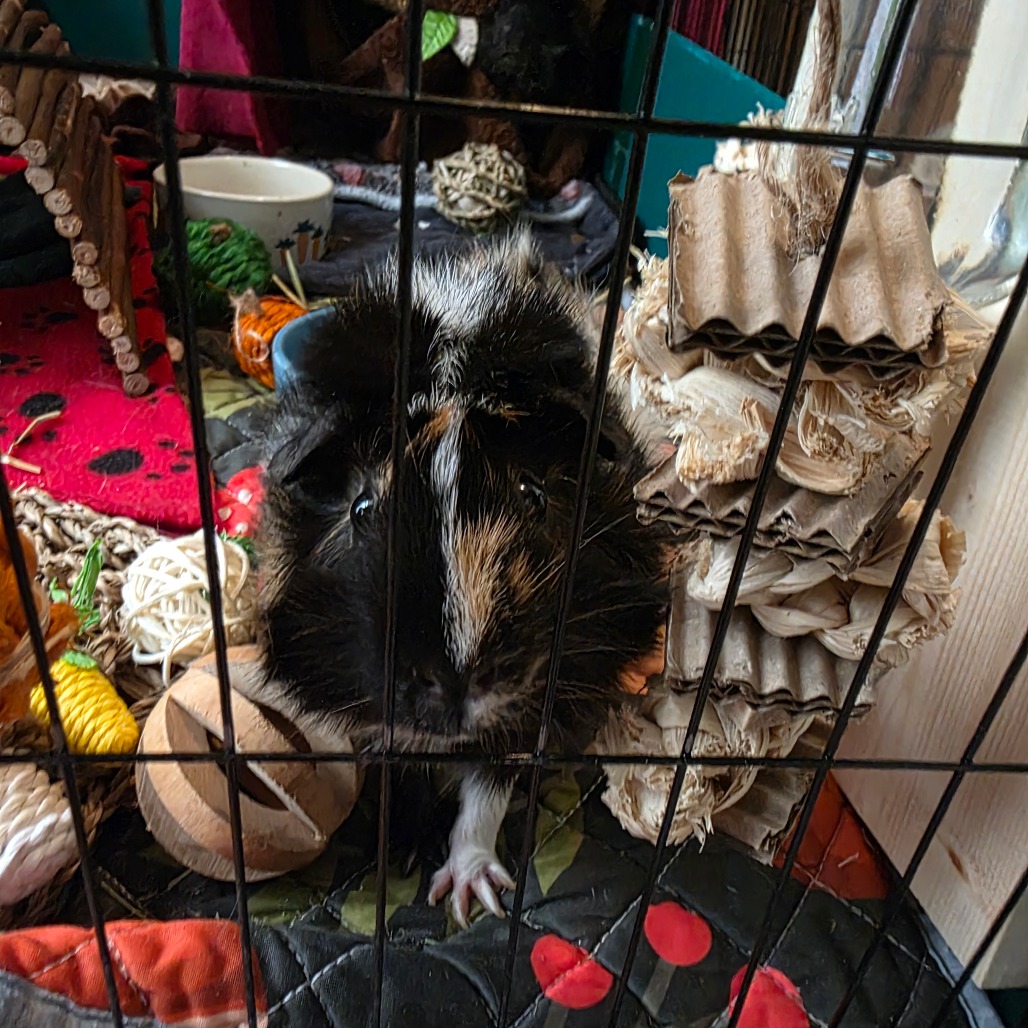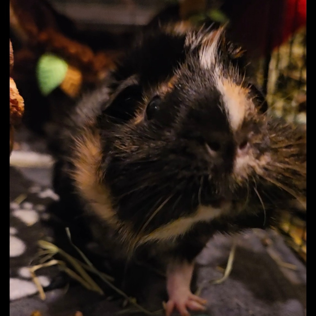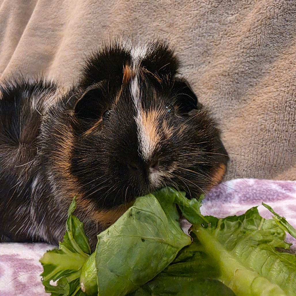 Swallowtail has the prettiest marbled fur and she uses it to her advantage. This sweet girl is a true social butterfly who loves hanging out in the open, happily munching hay and keeping up with the neighborhood gossip by chatting through the pen walls with fellow piggies.