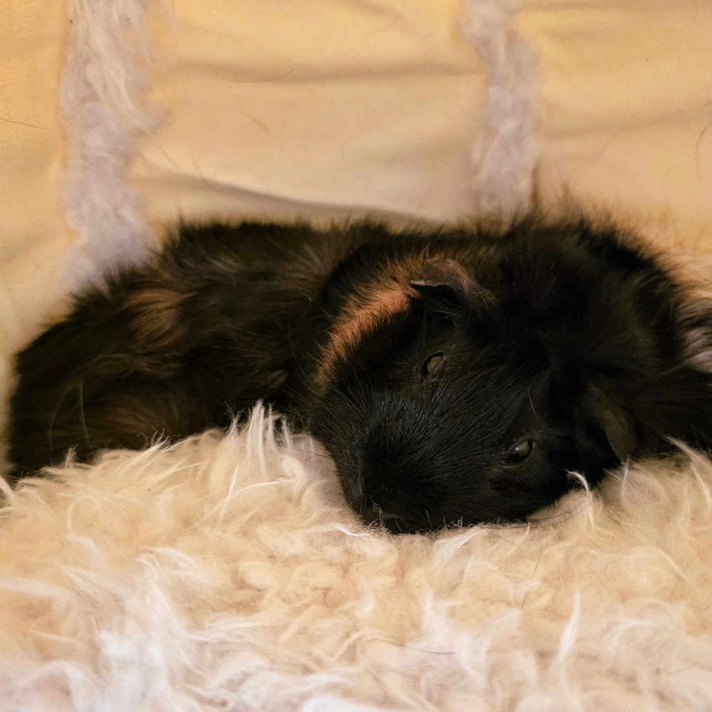 Hornworm’s pretty dark fur sometimes makes it hard to find since she prefers to feel safe inside her nook. While she’s not a fan of being handled (and will absolutely let you know her thoughts on the matter), her confidence blossoms when Swallowtail is by her side, especially if there are cucumbers involved.