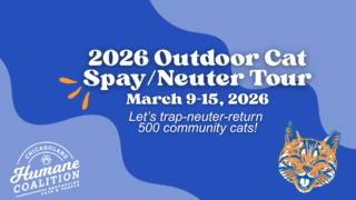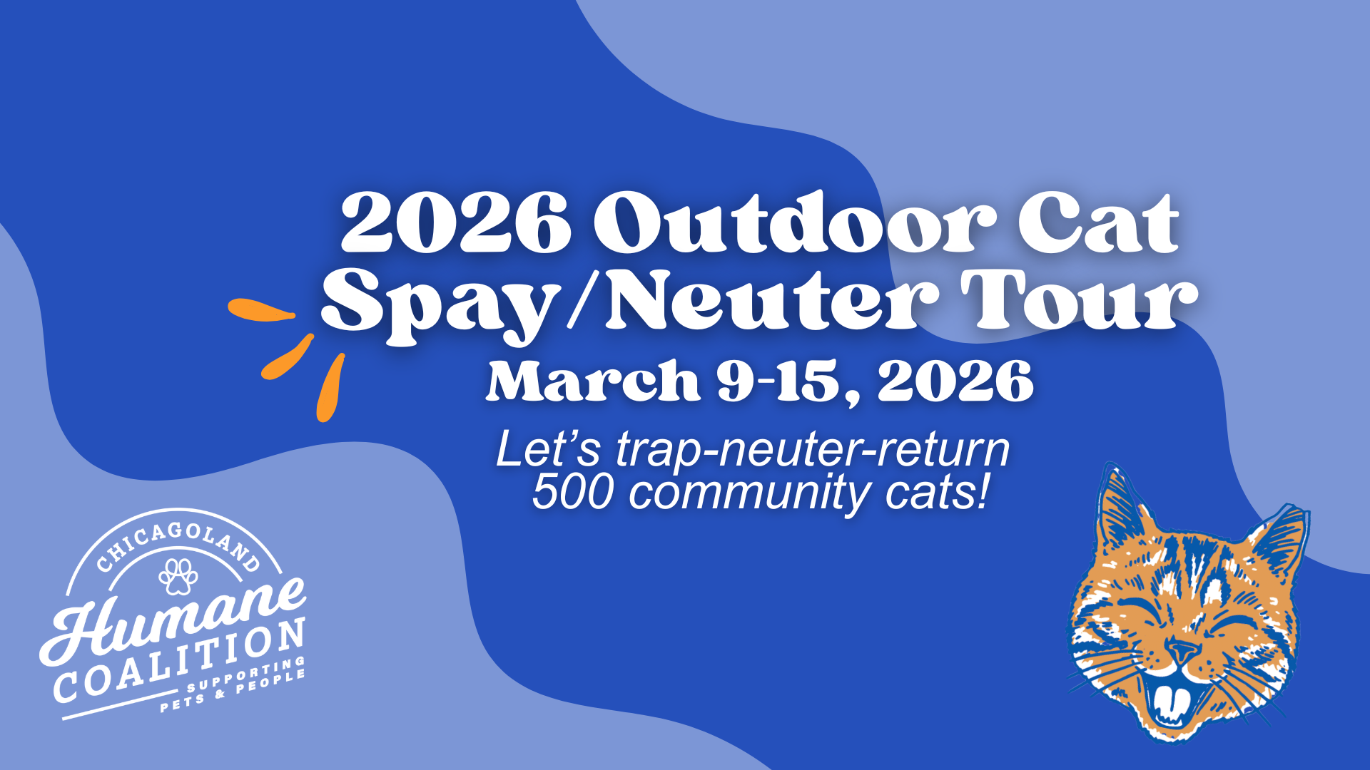 We’re proud to partner with the Chicagoland Humane Coalition for the 2026 Outdoor Cat Spay/Neuter Tour! During this special event, we’ll offer free TNR surgeries and $60 off spay/neuter surgeries for owned cats.